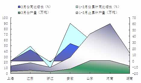 我國的起重機(jī)業(yè)在經(jīng)歷了瓶頸期之后迅速發(fā)展。2014年起重機(jī)業(yè)更是發(fā)展迅速。由圖可知,2014年我國起重機(jī)產(chǎn)量最高的省份是山東省,3月份的產(chǎn)量達(dá)到了23.2萬臺(tái),同比增長了15.87%。而產(chǎn)量相對(duì)較少的是浙江省,3月份的產(chǎn)量只有3.25萬臺(tái),同比下降了1.39%。兩省相差很大。而在全國部分省市中,3月份同比增長最高的省是安徽省,同比增長達(dá)到了28.33%。說明起重機(jī)的產(chǎn)量在安徽省有了較大的提高。
